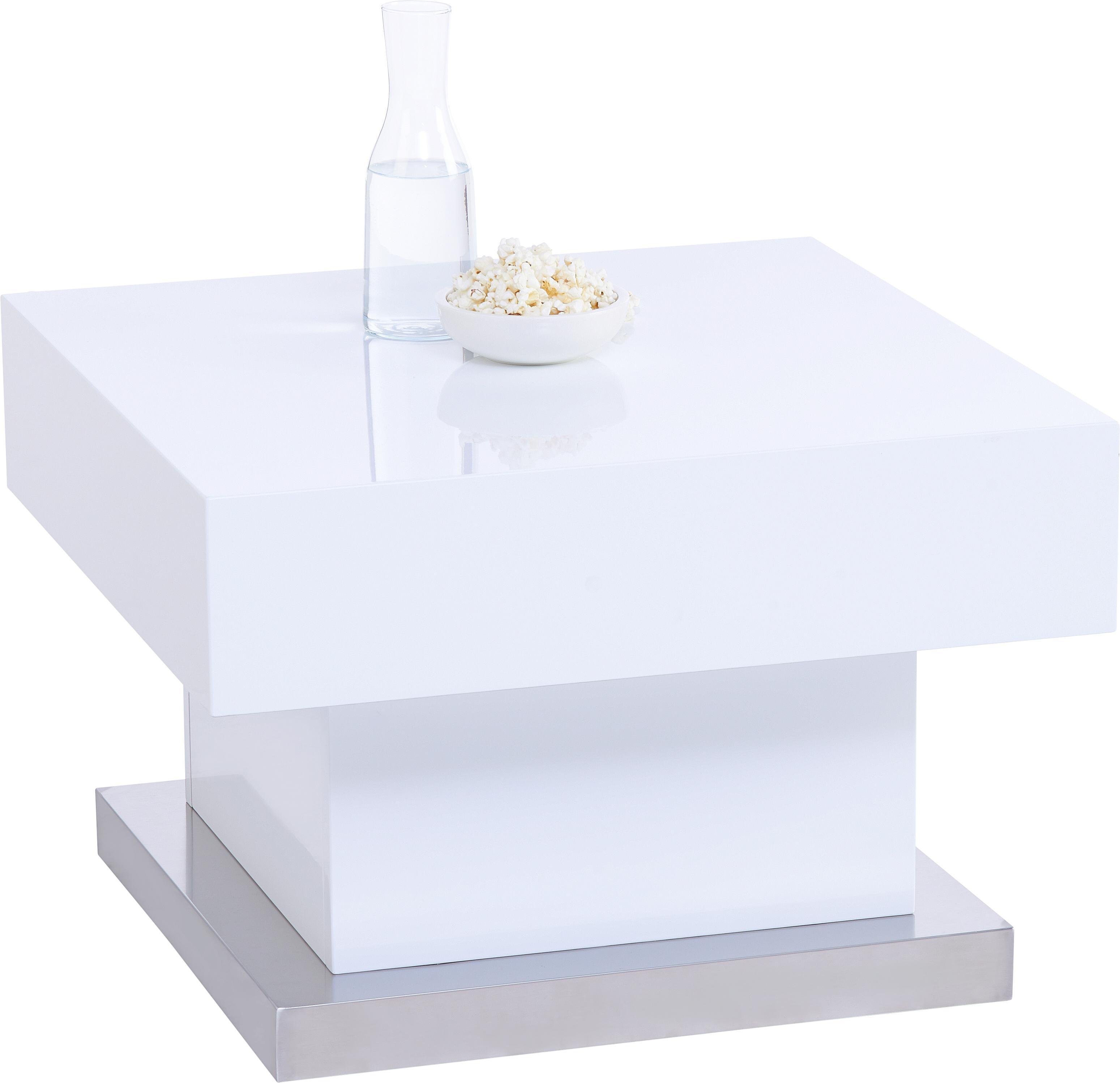 Weisse moderne home affaire couchtische wohnzimmertische aus massivholz mit schublade 16999 19999 couchtisch in weiss hochglanz lackiert mit saule aus metall in chrom optik auf rollen masse.